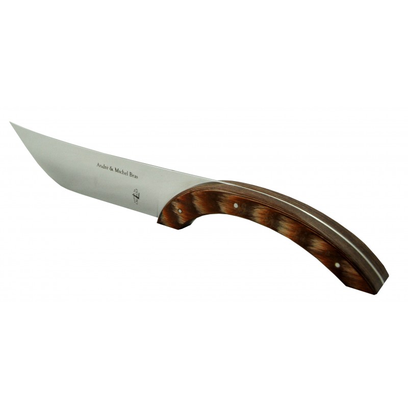 Modèle imaginé par Michel et André Bras, fabriqué par la Forge de Laguiole. Couteau avec lame en acier inoxydable et manche en bois stabilisé fabriqué par la Forge de Laguiole.